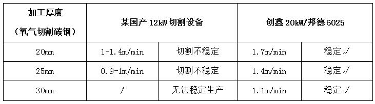 使用20kW切割20/25/30mm碳鋼板,在穩定生產情況下,效率相較12kW提高50%~60%,最高可提升70%。