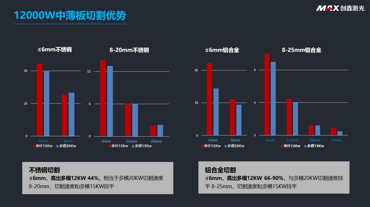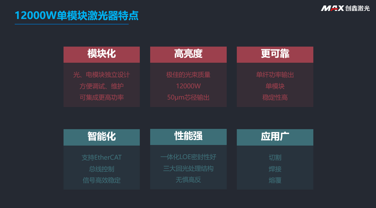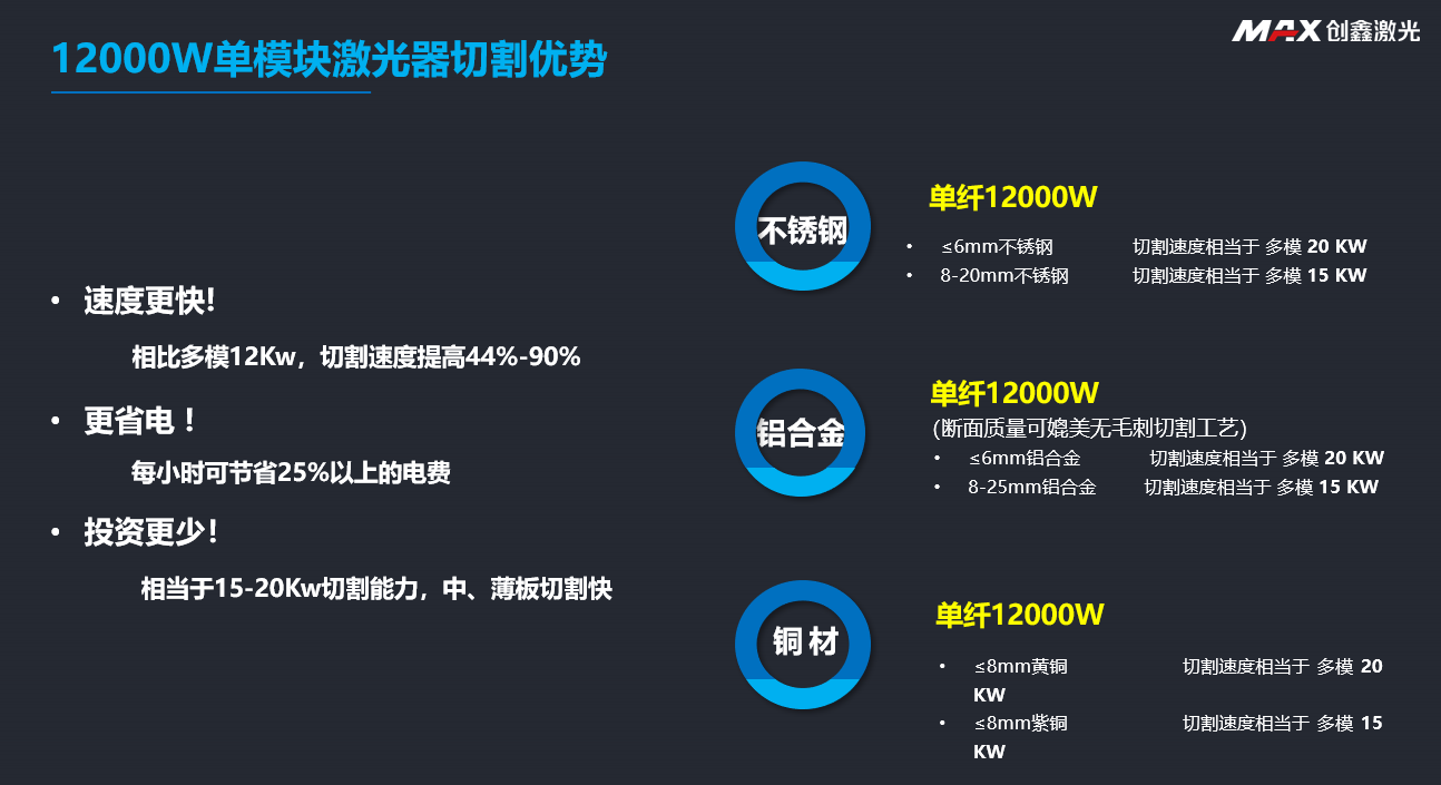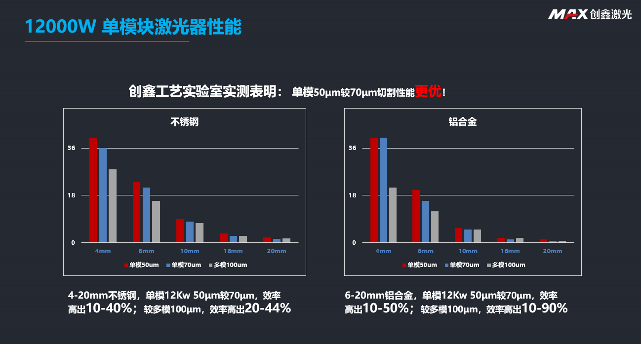 創鑫激光早期便先于同行布局單模塊激光器,從2018年推出單模塊3kW、2019年再推單模塊4kW、2020年再推單模塊6kW并且運用于多模40kW之上,一路刷新國產單模塊的記錄。去年下半年研發的單模塊12kW是公司響應國家號召、狠抓核心器件源頭技術的又一力作。目前單模塊激光器所用的泵源(一流芯片)、泵浦合束器(耦合效率>98%)、高功率剝模器(實現穩定>1500W的剝除能力),其技術指標均比肩海外品牌。 單模塊12kW從立項之初就以“提升效率”為目標,誕生之日起就在一線進行生產驗證。從客戶端獲取的數據,創鑫單模塊12kW在某些加工狀況下可達到多模20kW的效果。相信光博會后,創鑫單模塊12kW會成為鈑金加工市場的又一款“鈑金加工神器”。