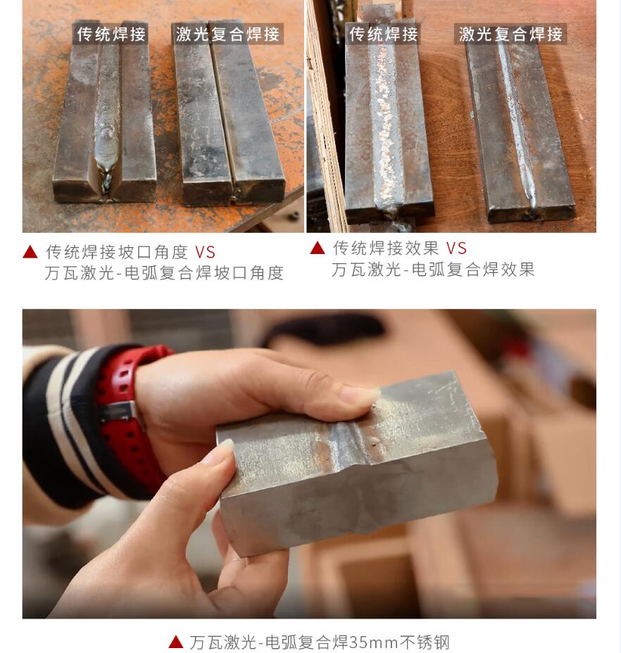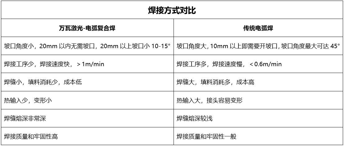 若使用萬瓦激光-電弧復合焊,20mm以下的鋼板不需要開坡口即可完成焊接,20mm以上鋼板只需要開傳統坡口角度的四分之一即可,大大壓縮坡口間隙,所需焊料成本更小,且效率可提高6-10倍,實現生產效率和制造精度的雙重提升,牢固性也更強。