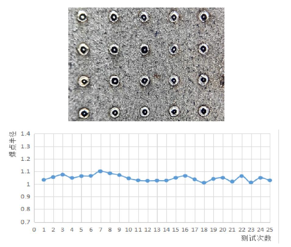 應用穩定性測試:焊點范圍1.01-1.10mm,平均焊點尺寸1.055mm,焊點波動4.3%,焊點均勻。