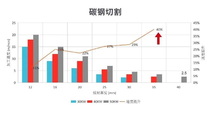 相對于40kW,50kW碳鋼厚板整體切割速度提升了20%