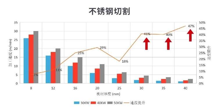 相對于40kW,50kW不銹鋼厚板切割速度提升40%以上