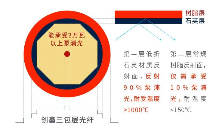光纖是激光產品的主要介質,光纖可承受能力越強越能支撐更高的功率,終端加工時使用起來就越穩定不易出故障。創鑫激光高亮度激光器采用獨家專利的三包層技術光纖,能承受3萬瓦以上泵浦光,光能量承載力更大,是常規雙包層光纖的10倍,承受溫升能力更強,確保小芯徑高能量輸出的穩定性。