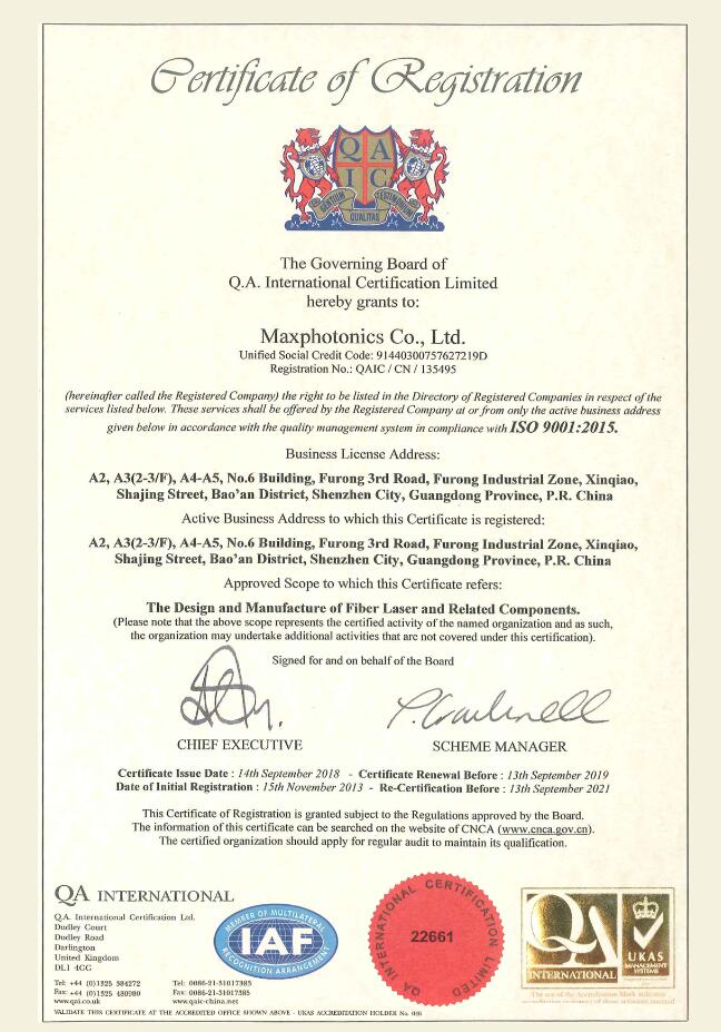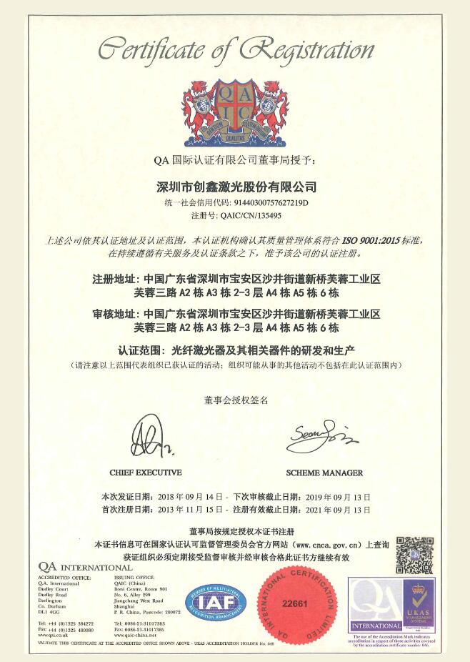 在創(chuàng)鑫人的不懈努力下,經(jīng)過認證機構(gòu)專家全面、嚴格、細致的指導(dǎo)和審核,確認創(chuàng)鑫激光質(zhì)量管理體系符合ISO9001:2015質(zhì)量管理體系標準的要求,并于2018年9月向創(chuàng)鑫激光頒發(fā)了ISO9001:2015版質(zhì)量管理體系認證證書。