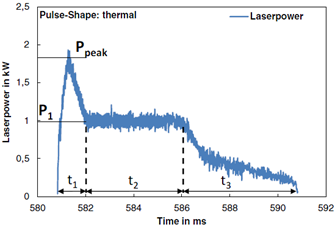 焊接鋁、銅等高反材料時(shí),不同的焊接波形對(duì)焊接質(zhì)量影響很大。利用帶有前置尖峰的激光波形,可突破高反射率屏障,瞬間的高峰值功率可以迅速改變金屬表面狀態(tài),使其溫度上升至熔點(diǎn),從而降低金屬表面的反射率,提高能量的利用率。另外,由于銅鋁等材料導(dǎo)熱速度快,故利用緩降波形,可以優(yōu)化焊點(diǎn)外觀。