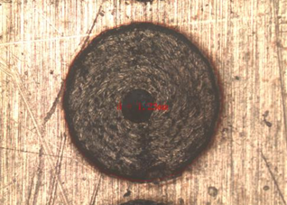 另一方面,金、銀、銅、鋼等材料對(duì)激光吸收率隨波長(zhǎng)增大而減小,對(duì)于銅而言,當(dāng)激光波長(zhǎng)為532nm時(shí),銅的吸收率接近40%。對(duì)比分析紅外激光器和綠光激光器特征可知,紅外激光器光斑尺寸較大,焦深短,紫銅對(duì)其吸收率低;綠光激光器光斑尺寸小,焦深長(zhǎng),紫銅對(duì)其吸收率高。分別采用紅外激光器和綠光激光器對(duì)紫銅進(jìn)行脈沖點(diǎn)焊,可以發(fā)現(xiàn)紅外激光器焊后焊點(diǎn)大小不一致,而綠光激光器焊點(diǎn)大小更均勻,深度一致,表面光滑(圖1-2)。采用綠光激光器焊接效果更穩(wěn)定,所需峰值功率會(huì)比紅外激光器低一半以上。