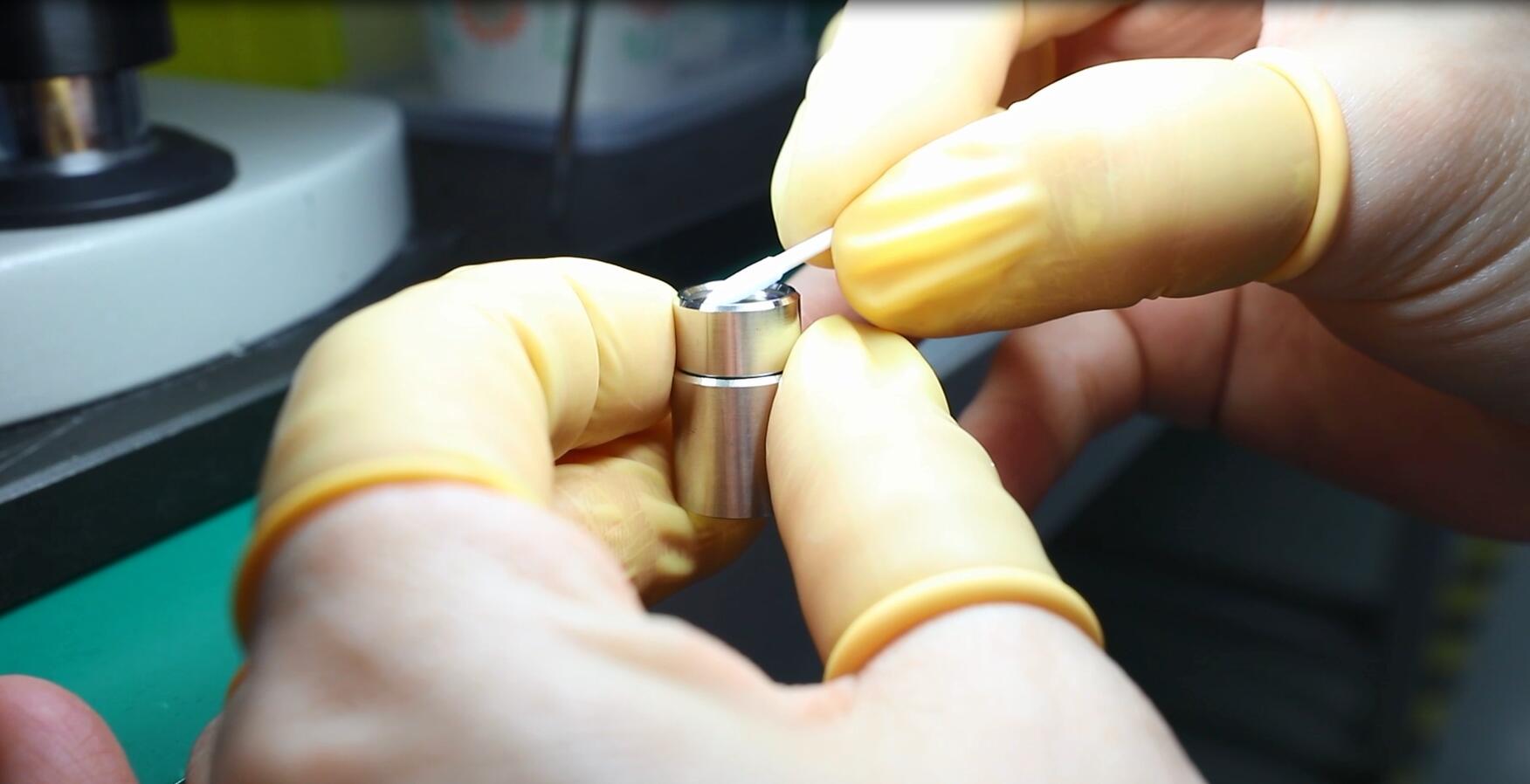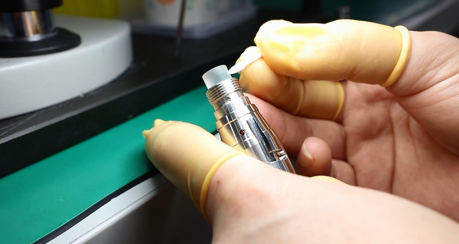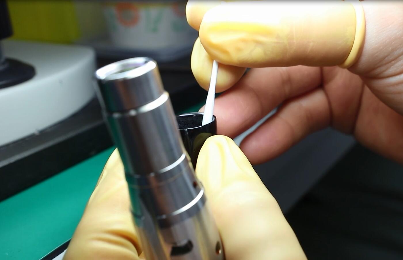 (5)用雙面膠木棒將保護內蓋上的灰塵粘掉,再用棉簽和酒精進一步清潔干凈套回連接器上。