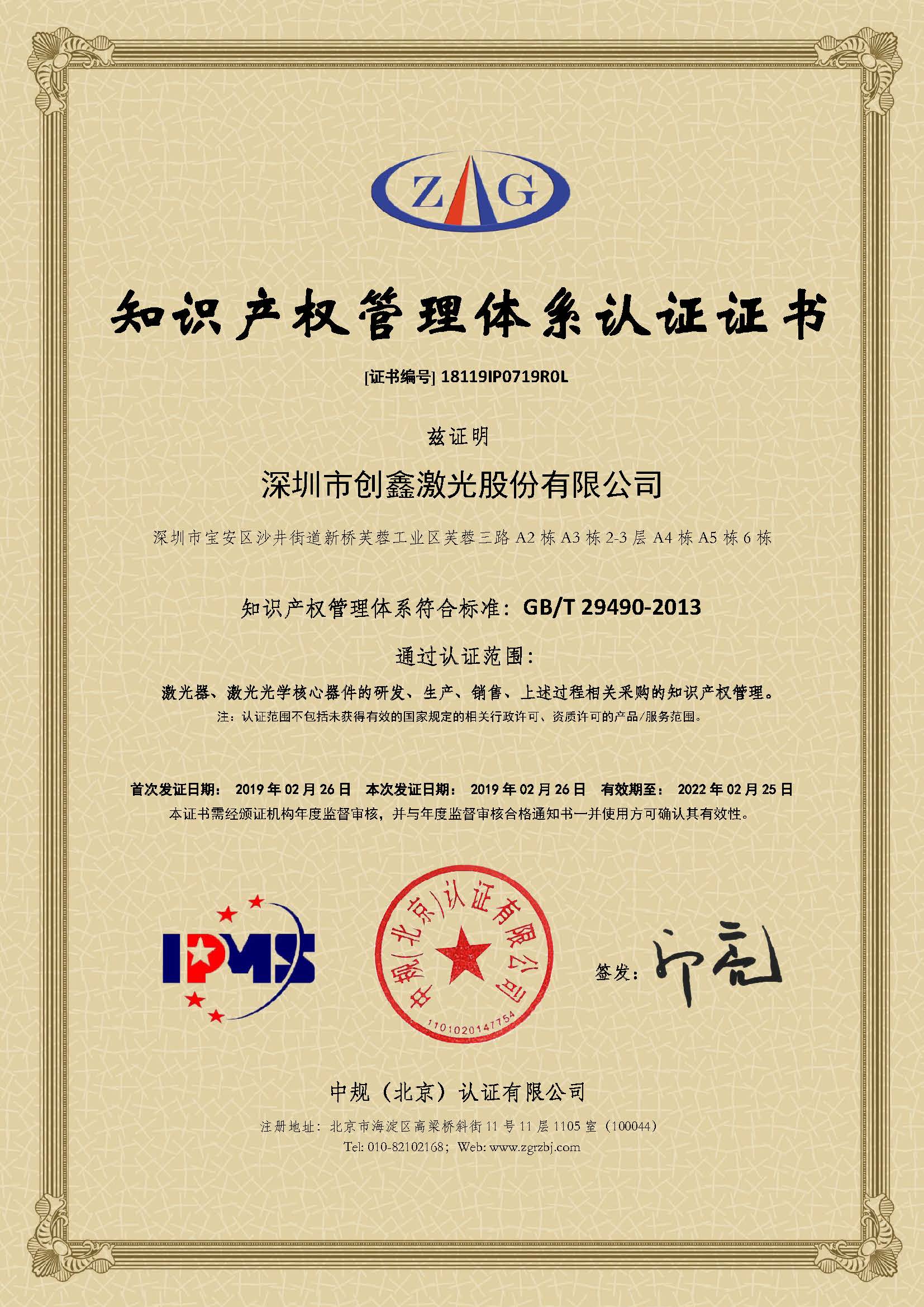 近日,創鑫激光憑借公司知識產權管理體系的規范性及嚴謹性,順利地通過了國內權威知識產權體系認證機構——中規(北京)認證有限公司知識產權專家組的評審,并獲得了《知識產權管理體系認證證書》。意味著創鑫激光在知識產權的管理、創造、運用和保護等方面邁上了新臺階,也標志著創鑫激光在知識產權管理方面達到國家標準。