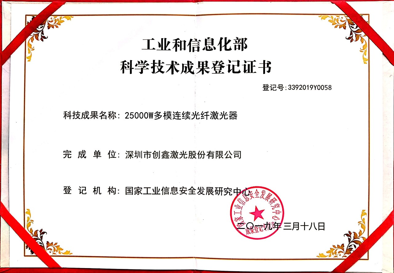 ▲25000W多模連續光纖激光器工信部頒發科技成果登記證書