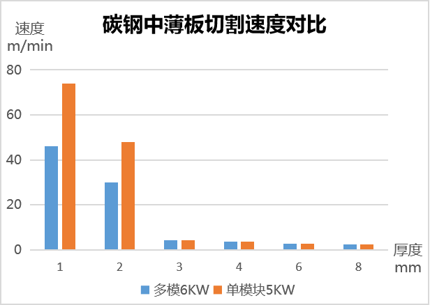 從測試數據得出:對比多模6KW,單模塊5KW切割碳鋼,1-2mm薄板采用氮氣切割效率提高60%,3-8mm厚度切割速度一致。