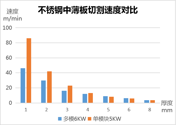 從測試數據得出:對比多模6KW,單模塊5KW切割不銹鋼,1-4mm中薄板效率提高8%-87%,5-8mm厚度切割速度一致。