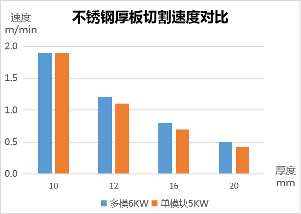 從測試數據得出:對比多模6KW,單模塊5KW切割不銹鋼,10-20mm厚板切割速度一致。