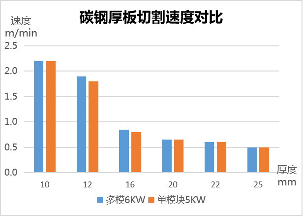 從測試數據得出:對比多模6KW,單模塊5KW切割碳鋼,10-25mm厚板切割速度一致。