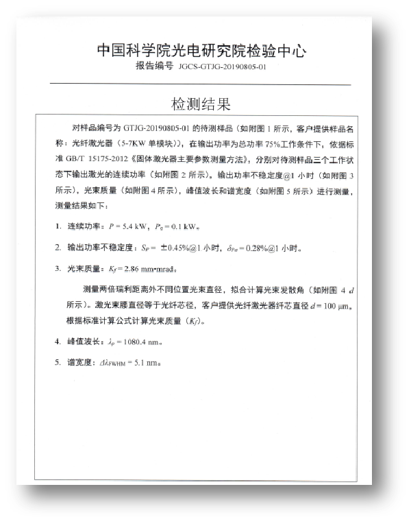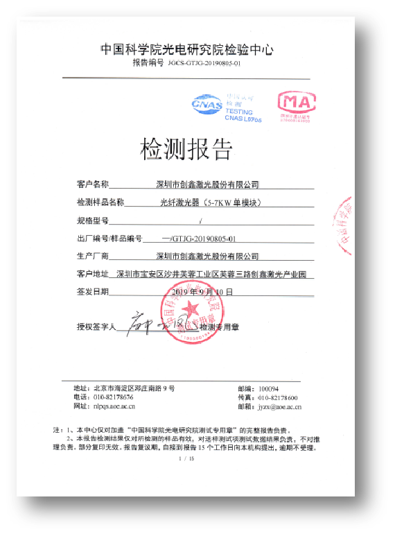 創鑫激光單模塊5000W連續光纖激光器經中國科學院光電研究院檢驗中心的專家組權威檢測,檢測結果顯示單模塊5000W各項指標參數均符合行業規定,并對此款產品出具了專業檢測報告。