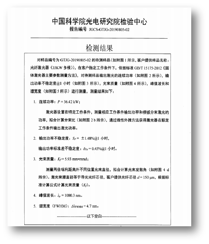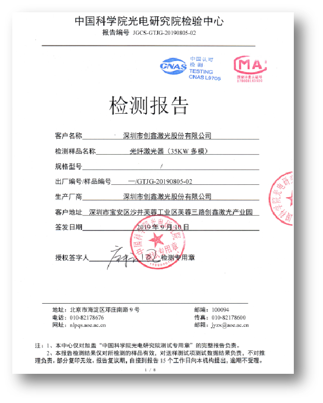 在產(chǎn)品上市前,中國(guó)科學(xué)院光電研究院檢驗(yàn)中心的專(zhuān)家組對(duì)35000W超高功率光纖激光器進(jìn)行現(xiàn)場(chǎng)實(shí)地檢驗(yàn),其檢測(cè)結(jié)果顯示創(chuàng)鑫激光35000W超高功率光纖激光器各項(xiàng)指標(biāo)參數(shù)均符合行業(yè)規(guī)定,并對(duì)此款產(chǎn)品出具了專(zhuān)業(yè)檢測(cè)報(bào)告。